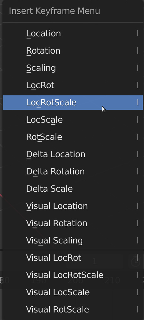 Druk I en selecteer LocRotScale van het Insert keyframe menu.